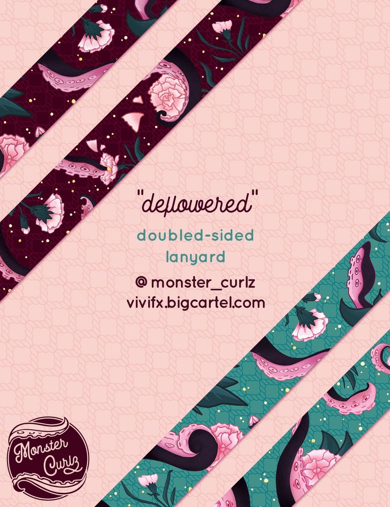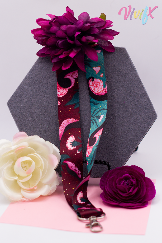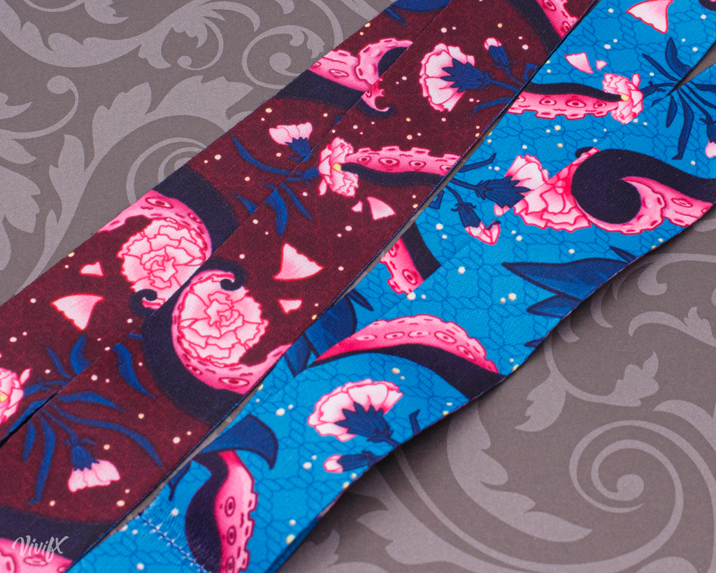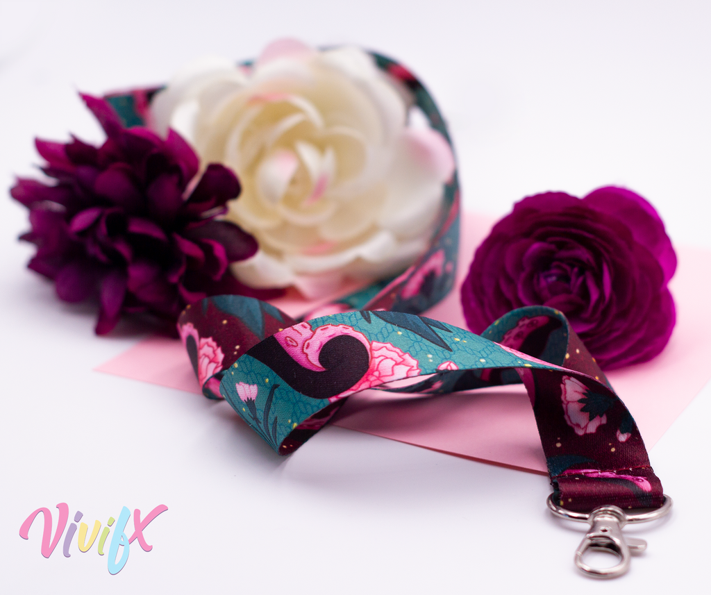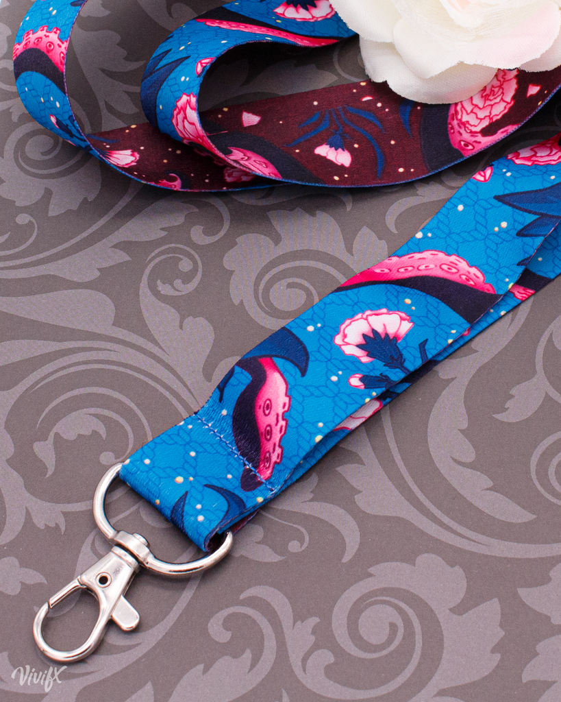 Lanyard is 2.5 cm wide and 90cm long. Each lanyard is double-sided with different versions of the design front and back.